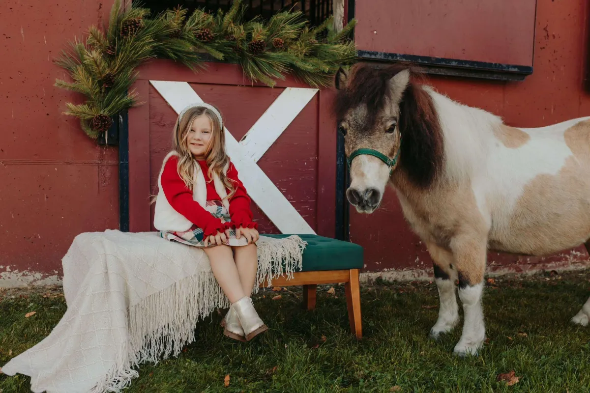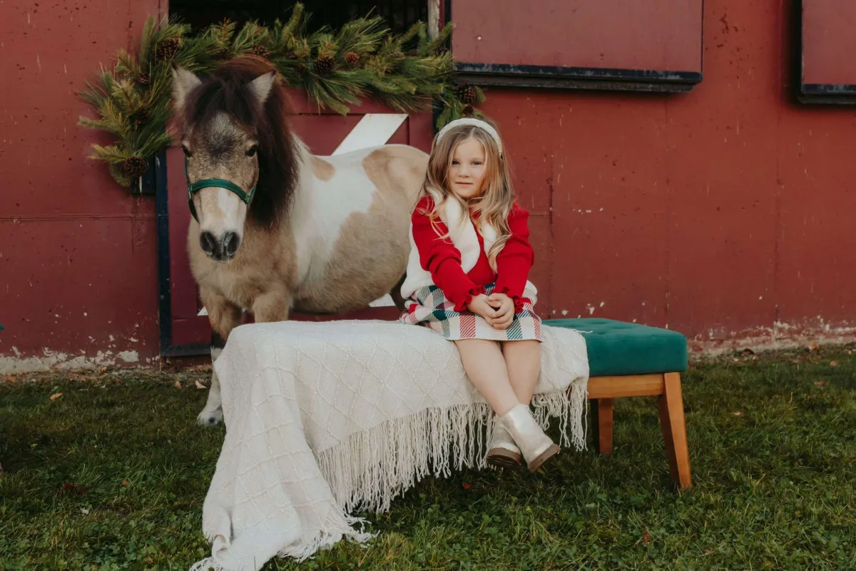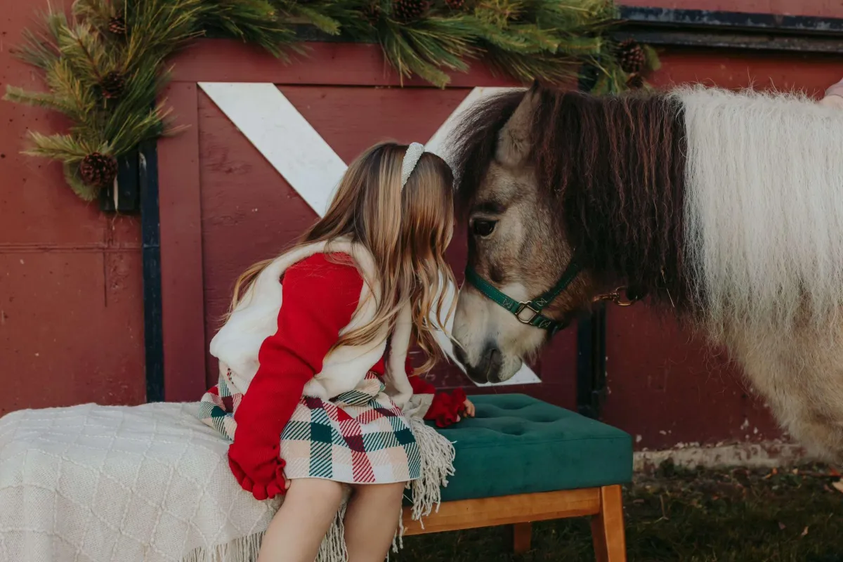 ✨ Your child will have a delightful 15-minute photoshoot with a beautiful and friendly pony adorned in festive Christmas attire.